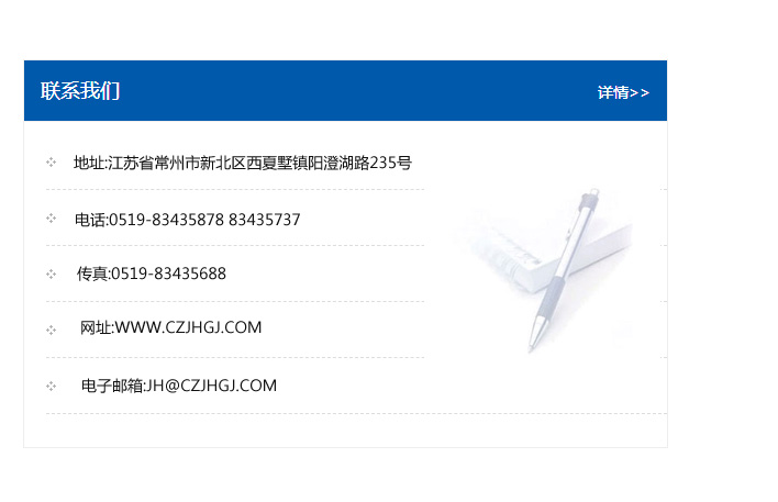 地址:常州市新北區友邦商務大廈1幢16、17層  電話:0519-85101652  傳真:0519-85112595  郵編:213022  網址:www.cz-jiayue_cn.xia1688.com  郵箱:xiajifengaa@163.com